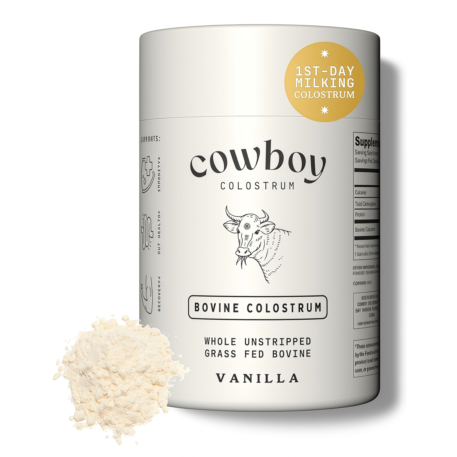 Cowboy Colostrum only sources first-day colostrum - collected within 24 hours after every calf is nourished - to preserve maximum bioactive potency. Our colostrum stays unstripped, whole, and as close to nature as possible. Unlike many brands that skim or strip fat, Cowboy keeps colostrum in its whole, full-fat form, maintaining all naturally occurring nutrients, peptides, and immune factors for optimal efficacy. Each serving delivers a robust 3 g dose - higher than most competitors - and comes in delicious, easy-to-mix flavors like vanilla, cacao, and unflavored.